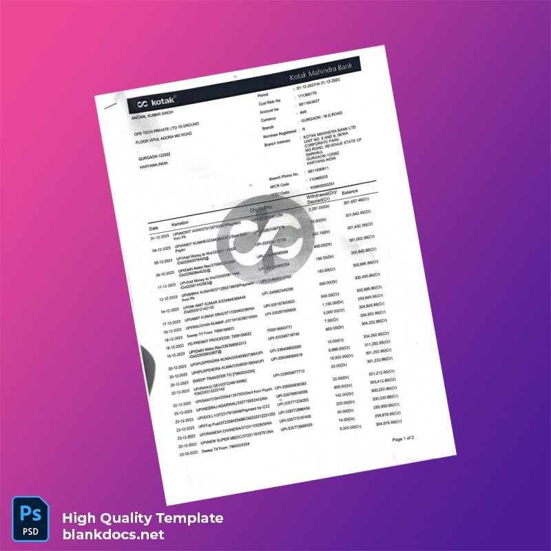 Transform your banking documentation today. Don’t let the lack of a professional statement hold you back from accomplishing your goals. Download the India Kotak Mahindra Bank Statement Template now and keep your financial documentation organized. Also, check out related resources for further assistance: bank statement template options to suit different needs. Invest in your productivity and remove frustrations—your time is valuable.
