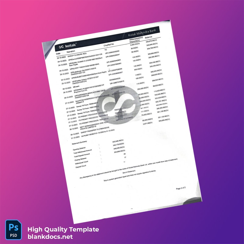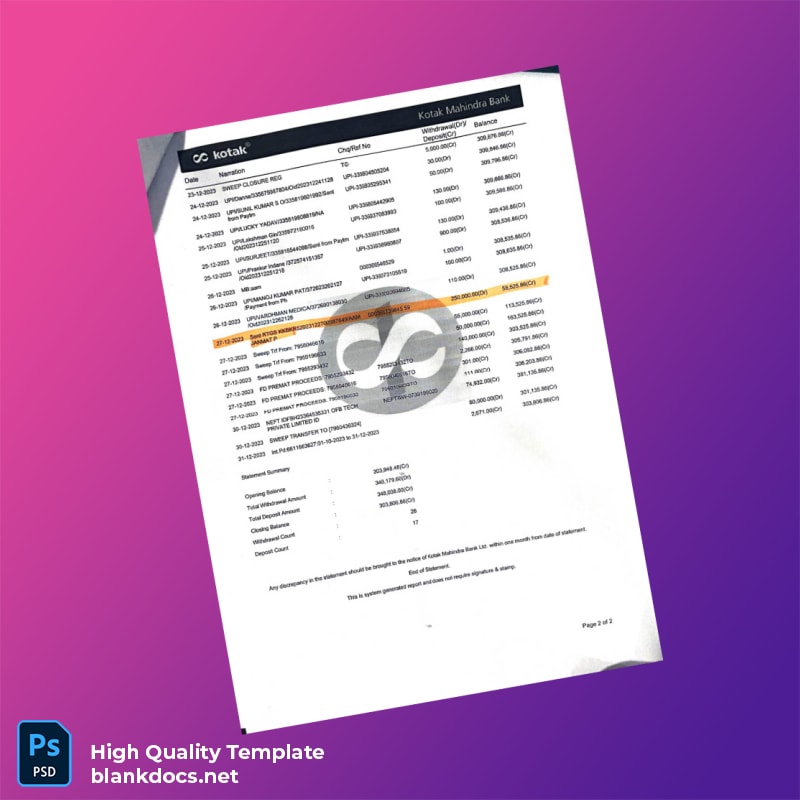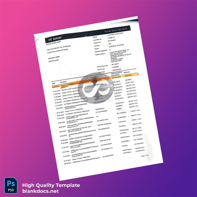 India Kotak Mahindra Bank Statement Template in Word and PDF formats