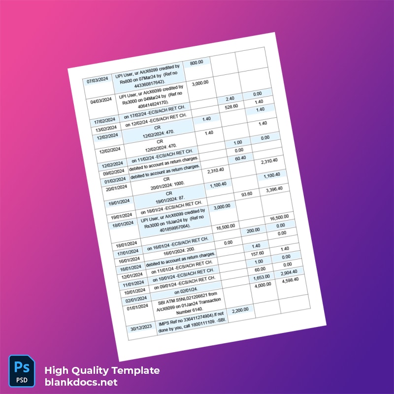 Don’t let missing documents hinder your professional journey. Take charge and elevate your documentation process with the India State Bank of India Bank Statement Template. Download your editable version now and experience the difference it makes. Explore our range of related products, such as our editable bank statement template word and the 3 months bank statement pdf.