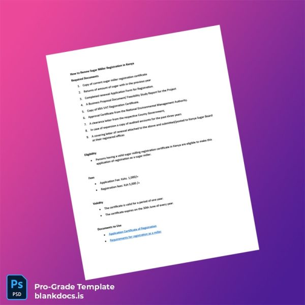 Download the Kenya Sugar Miller Registration Renewal Certificate Template (Word & PDF) for easy, editable renewal of your business registration certificate.