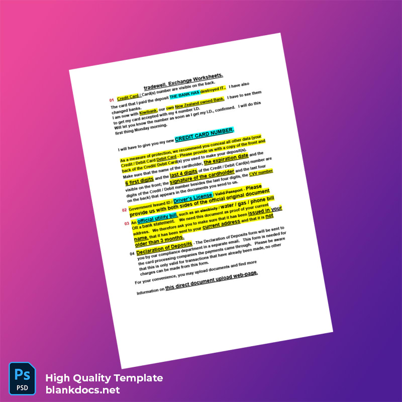 The New Zealand Tradewell Exchange Editable Worksheets Template in Word and PDF formats offers a versatile solution for professionals needing a reliable utility bill proof of address template. Designed for quick customization and professional use, this editable utility bill template ensures seamless document creation in both Word and PDF formats, catering perfectly to those seeking an instant, fillable utility bill template for verification or replacement purposes.