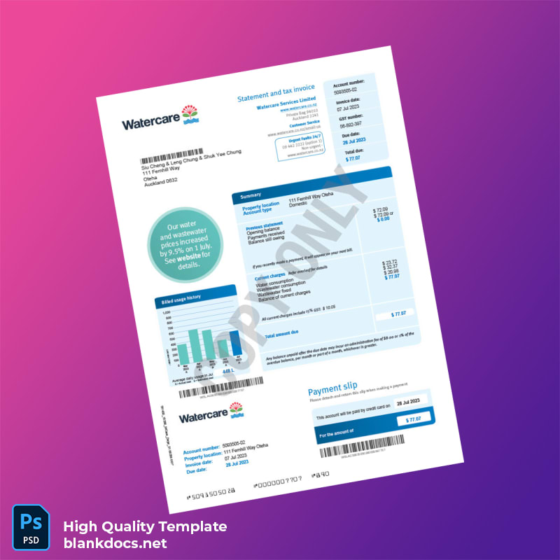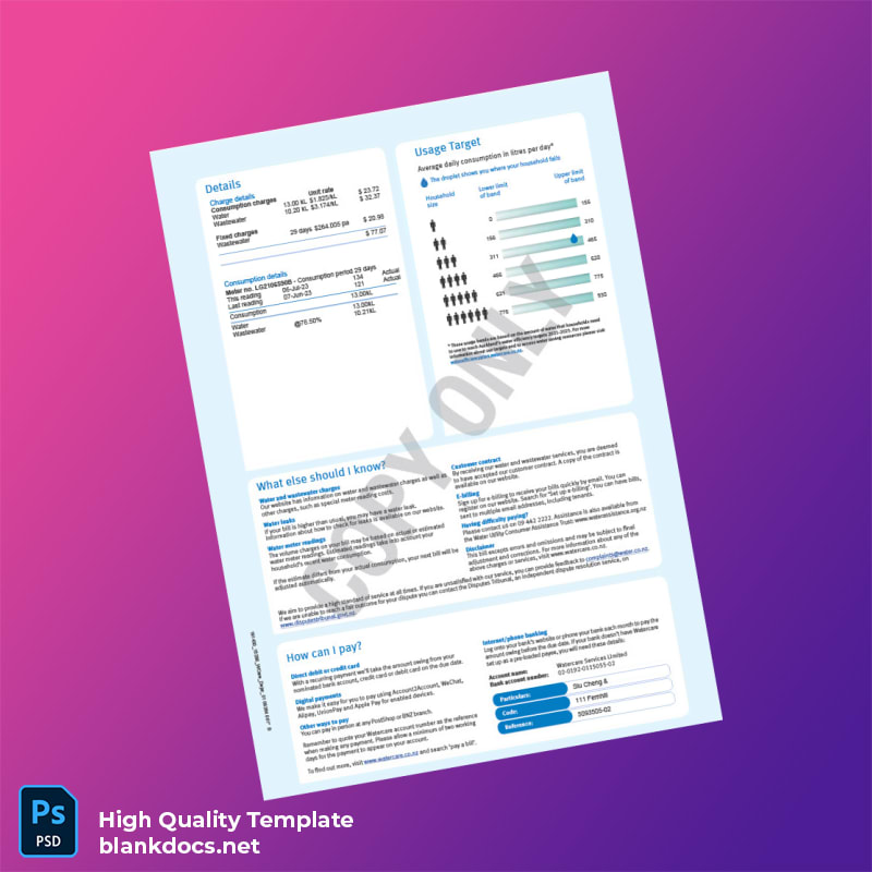 This water bill template word document replicates New Zealand Watercare Services’ official format, making it an ideal solution for anyone needing a credible utility bill replacement.