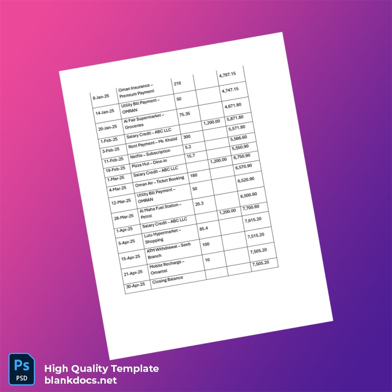 The Oman Bank Dhofar Editable Bank Statement Template offers a professional, easy-to-use solution for creating authentic-looking bank statements quickly. Available in both Word and PDF formats, this template is tailor-made for verifying your financial information and meeting documentation requirements with ease.