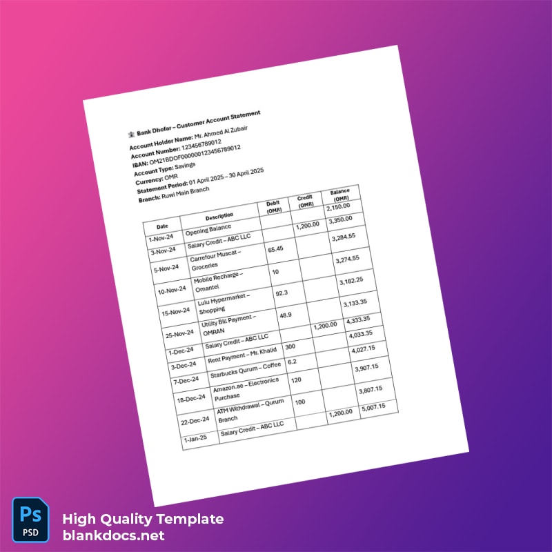 Oman Bank Dhofar Editable Bank Statement Template in Word and PDF Formats