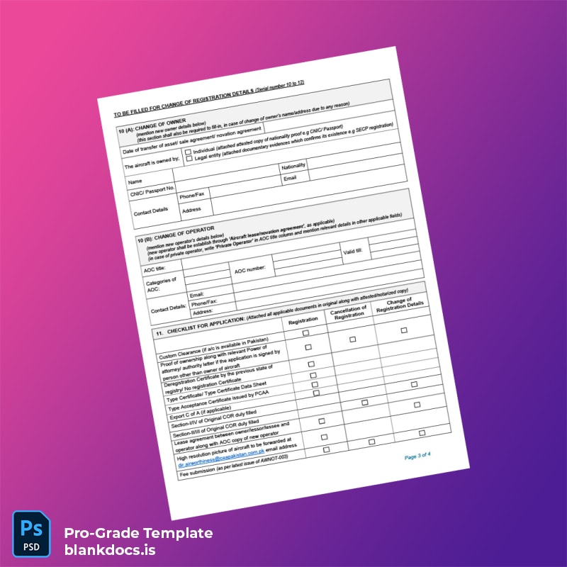 The Pakistan Civil Aviation Authority Application for Issue of Certificate of Registration Cancellation of Registration Change of Re Template (Word & PDF) is expertly designed to help aviation professionals and company representatives quickly handle essential registration formalities. Whether you need to issue a new certificate, cancel an outdated registration, or modify existing details, this editable registration certificate template offers a professional and time-saving solution tailored to your needs.