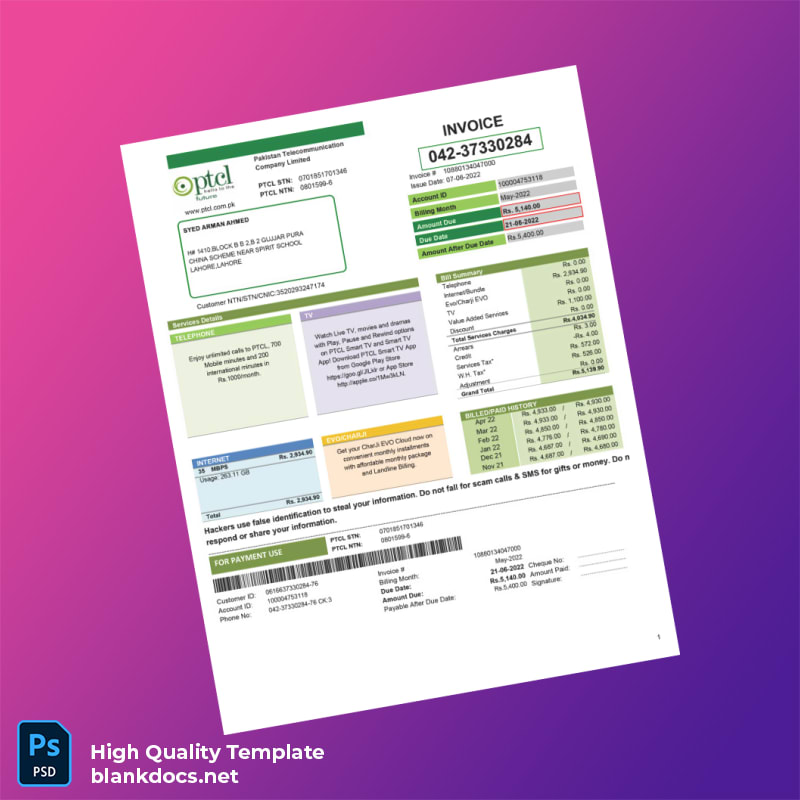 Pakistan PTCL Editable Utility Bill Template – Reliable Proof of Address in Word and PDF Formats