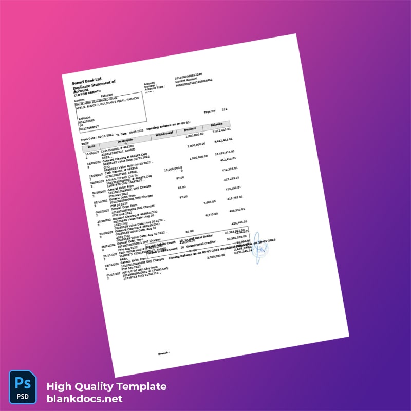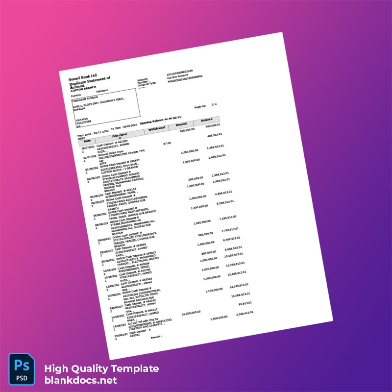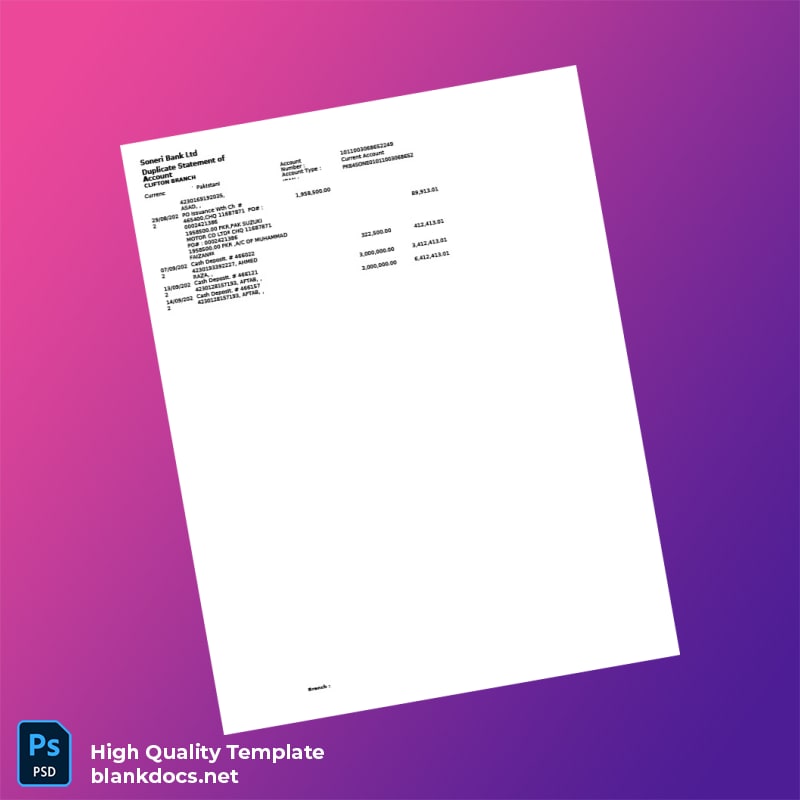The Pakistan Soneri Bank Statement Template in Word and PDF formats is your complete solution for swiftly obtaining a professional-looking bank statement. Ideal for financial needs or documentation, this template is designed for those who require a quick replacement, be it due to loss, theft, or expiration.