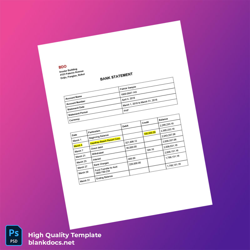 Philippines BDO Bank Statement Template in Word and PDF Formats