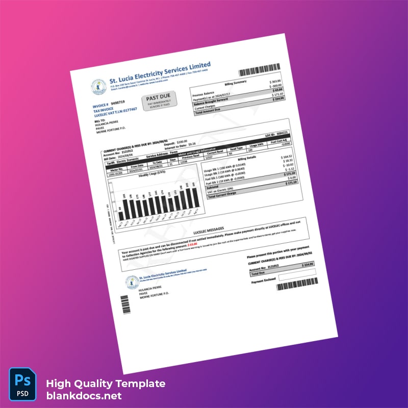 Effortlessly create an accurate, professional utility bill with the Saint Lucia Electricity Services Limited Editable Electricity Bill Template, available in both Word and PDF formats. Designed specifically for utility bill proof of address verification, this editable utility bill template is your essential tool for timely document replacement, professional presentations, and official verification needs.