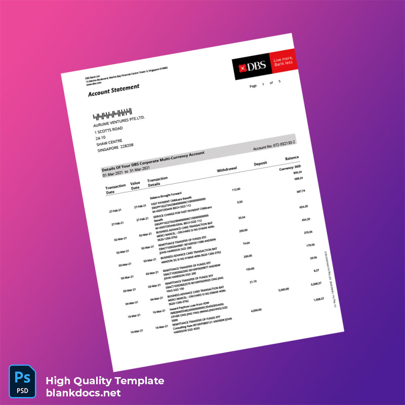 Singapore DBS Account Statement Template in Word and PDF formats 5 page