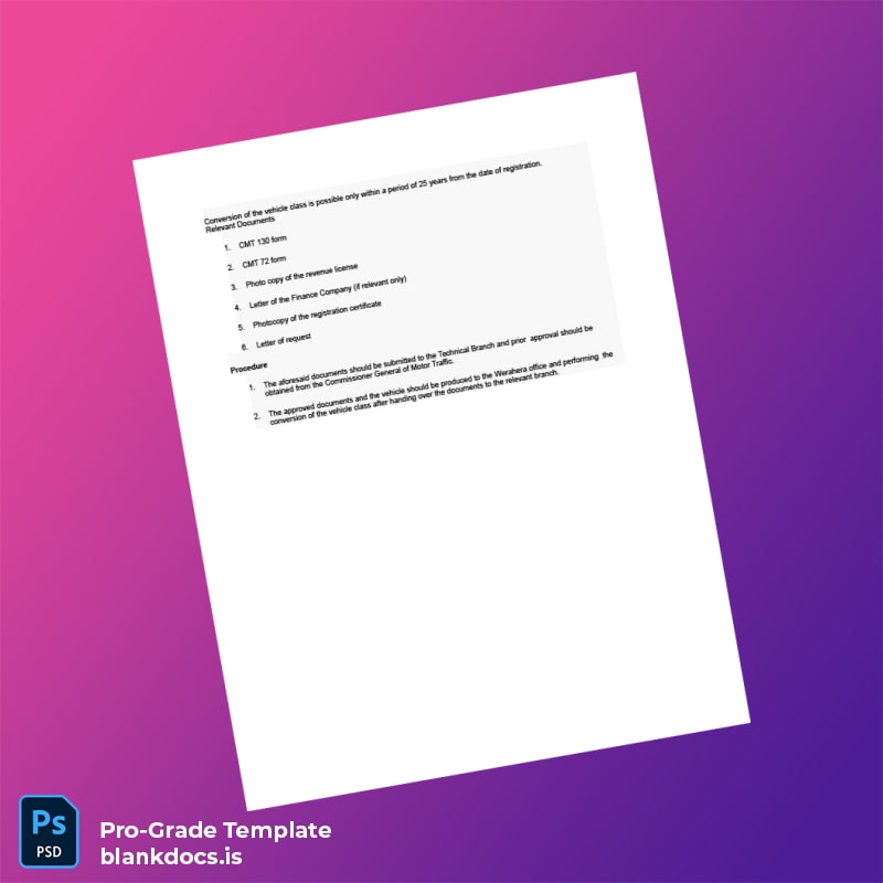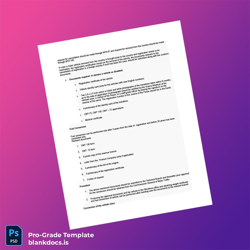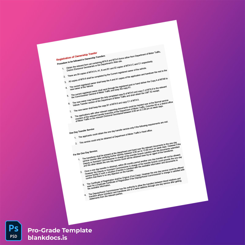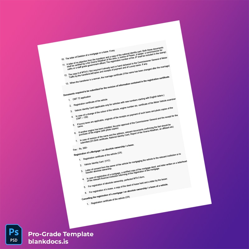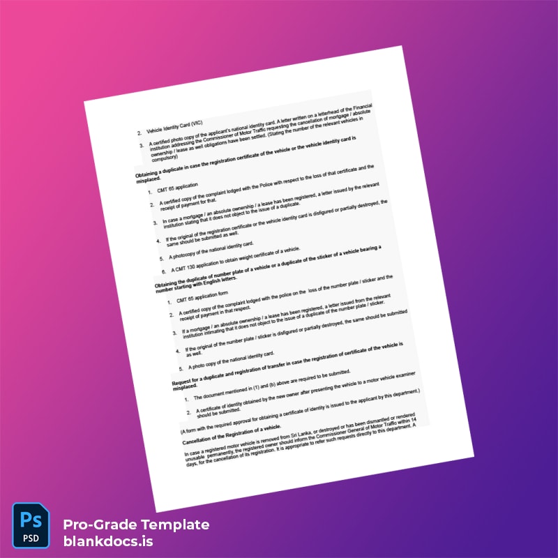 Be the first to review “Sri Lanka Vehicle Registration Authority Vehicle Ownership Transfer Registration Certificate Template (Word/PDF) 6 page”