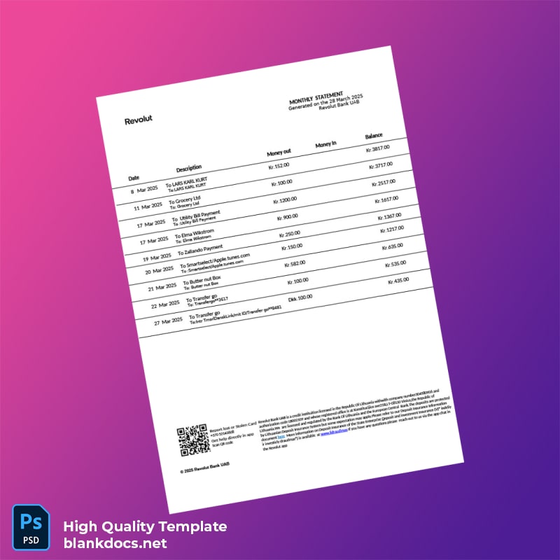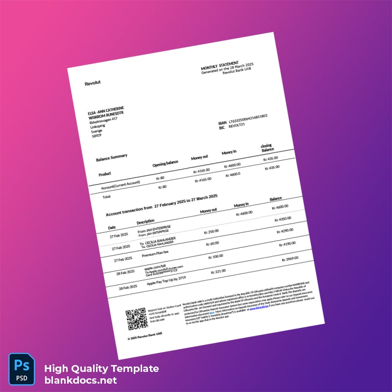 Sweden Revolut Bank UAB Editable Bank Statement Template in Word and PDF Formats
