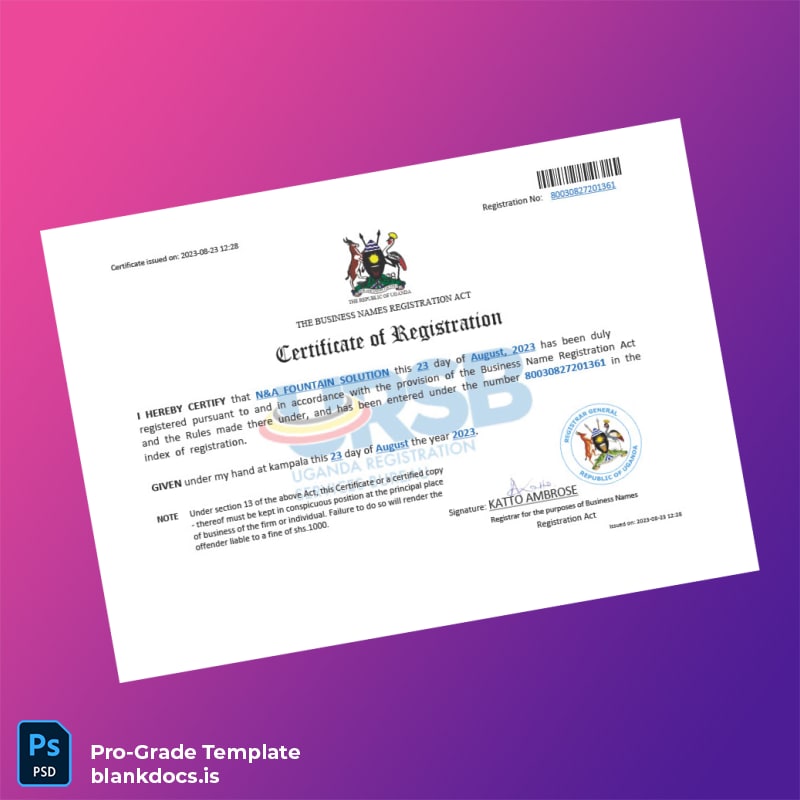 Empower your business registration process with this versatile and professionally designed certificate template. Optimize your document management, ensure compliance, and project a polished image to auditors, clients, and partners alike. Download your Uganda Business Name Registration Certificate Template (Word & PDF) today and experience effortless customization and reliability in one comprehensive package.