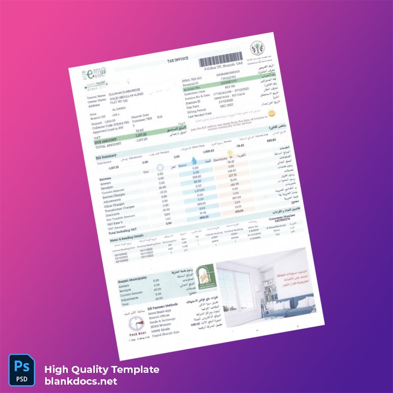 Purchase the United Arab Emirates Sharjah Municipality Editable Utility Bill Template today — your dependable partner for professional-grade, fillable utility bill template needs.
