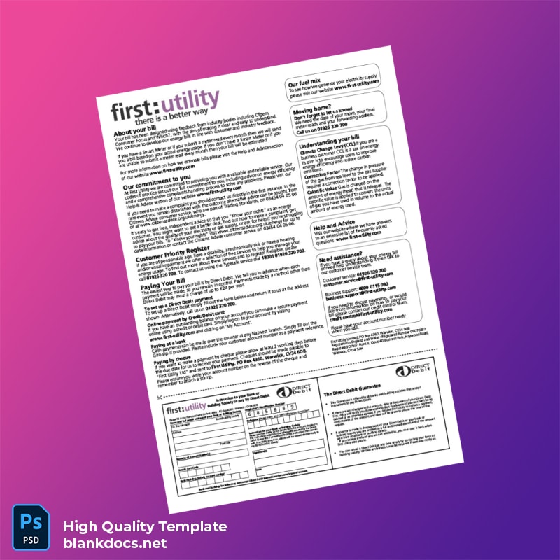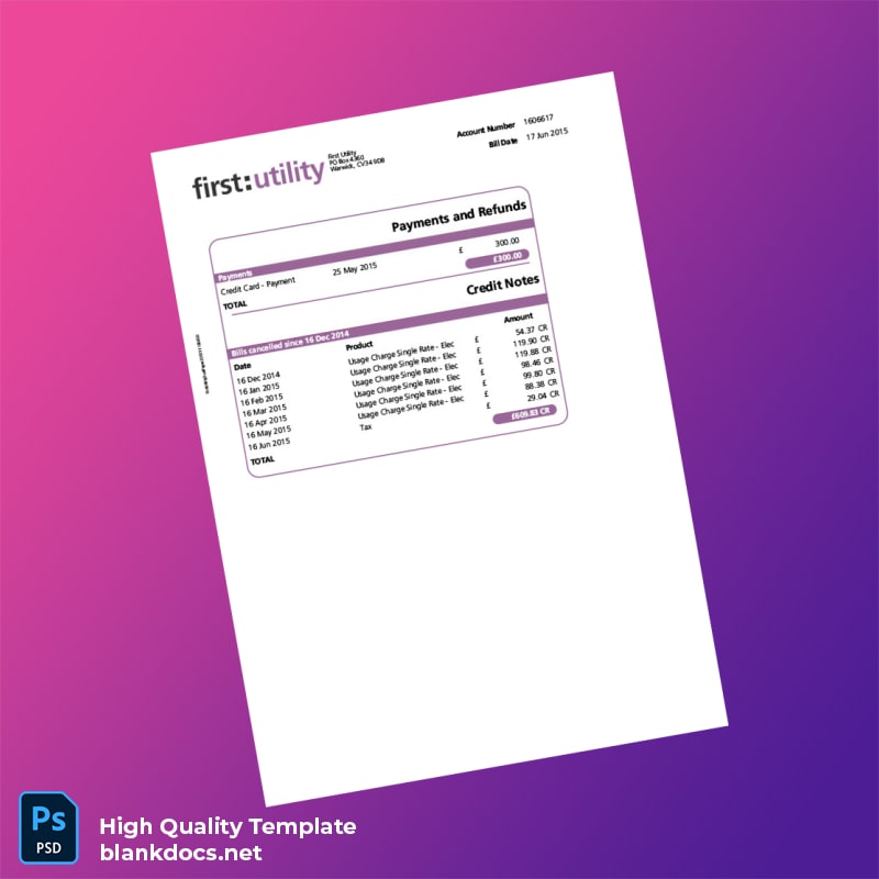 United Kingdom First Utility Editable Electricity Bill Template in Word and PDF Formats