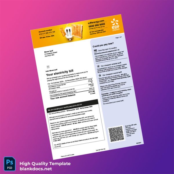 Effortlessly create a professional and authentic-looking electricity bill with the United Kingdom N_A Editable Electricity Bill Template, available in both Word and PDF formats. This versatile template serves as a reliable utility bill proof of address template, ideal for professionals needing quick, customizable documentation for verification, applications, or record-keeping.