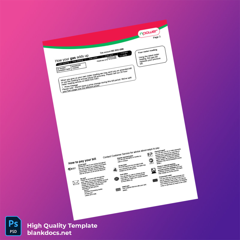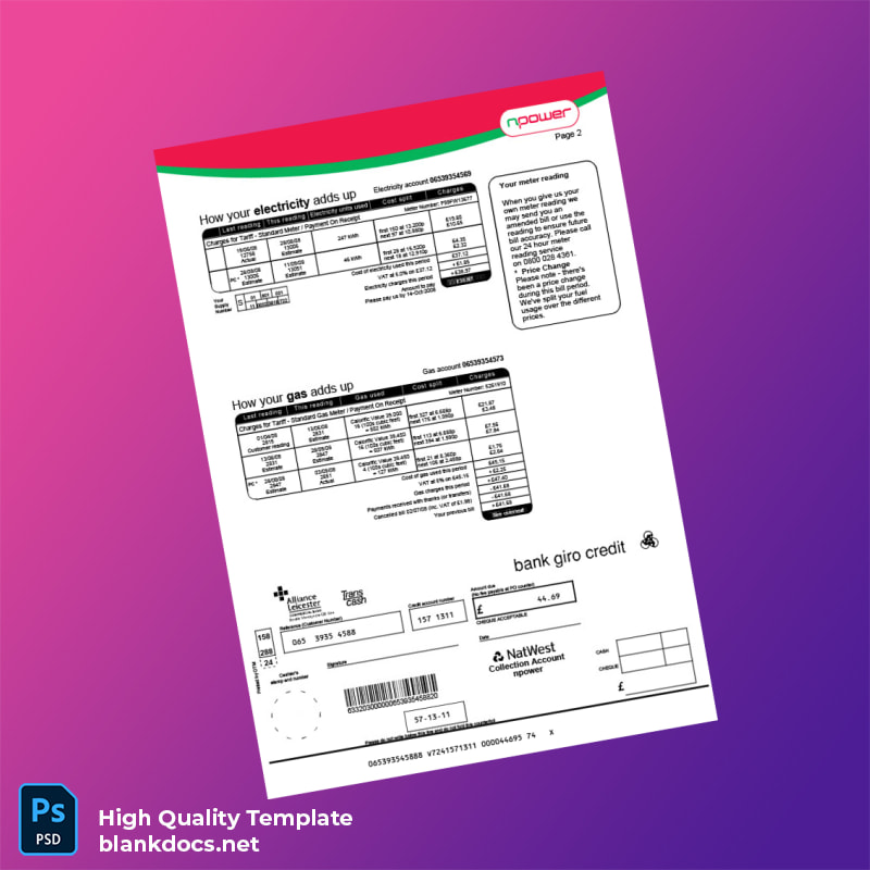 United Kingdom Npower Editable Dual Fuel Bill Template in Word and PDF formats 3 page
