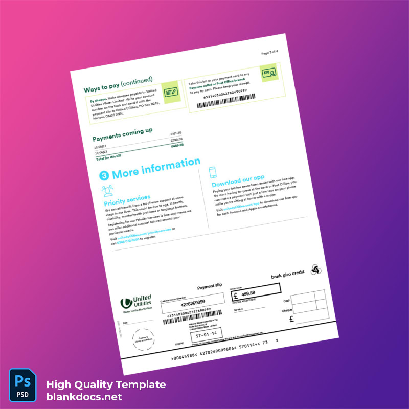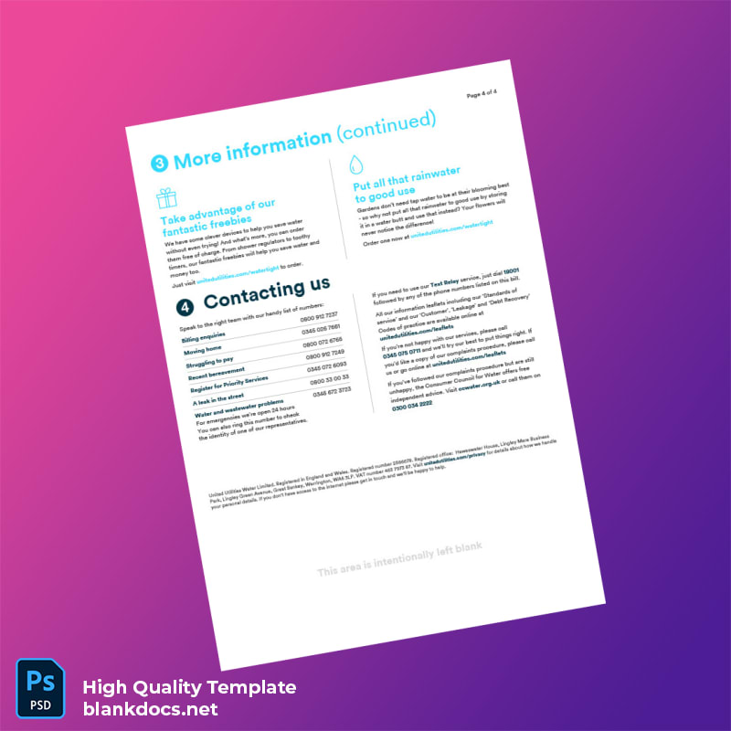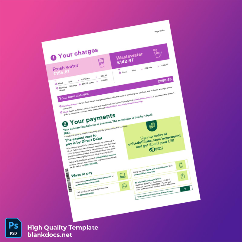 United Kingdom United Utilities Editable Water Bill Template in Word and PDF