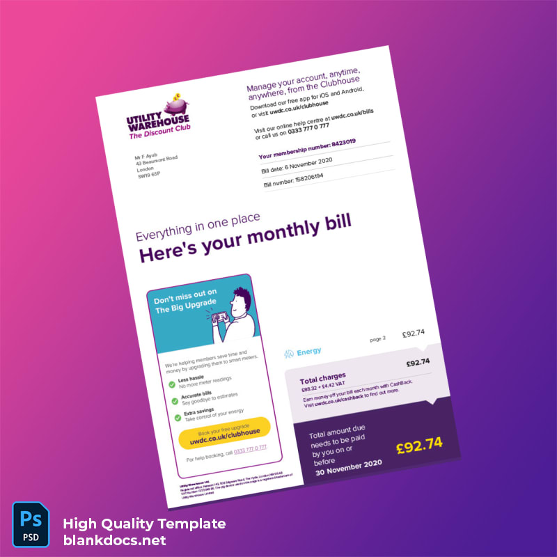 United Kingdom Utility Warehouse Editable Utility Bill Template in Word and PDF