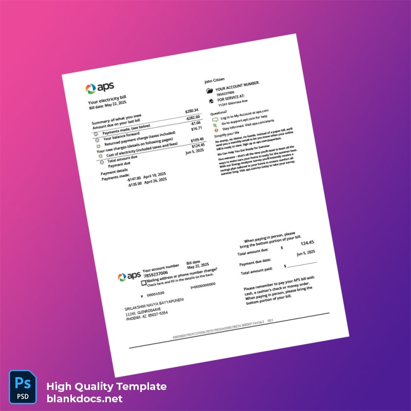 Discover the United States APS Editable Utility Bill Template in Word and PDF Formats