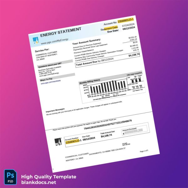 United States Pacific Gas And Electric Company Editable Utility Bill Template in Word and PDF formats 5 page