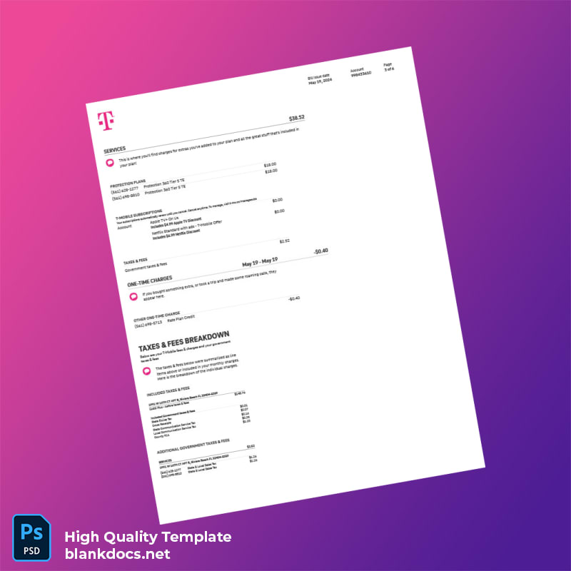 United States T-Mobile US Editable Summary Bill Template in Word and PDF formats 6 page