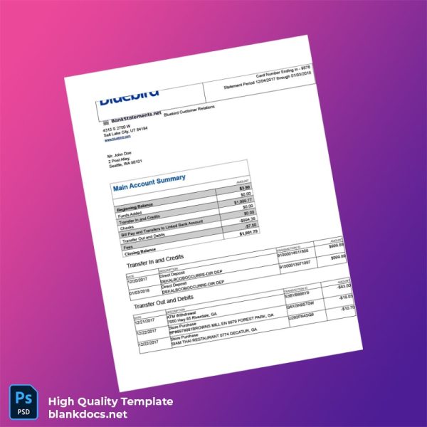 Unlock the Power of Seamless Financial Management with our USA Bluebird Bank Statement Template, available in editable Word and PDF formats. Designed for professionals who require quick access to reliable financial documentation, this template not only meets your urgent needs but also gives you the flexibility to tailor it as per your requirements.