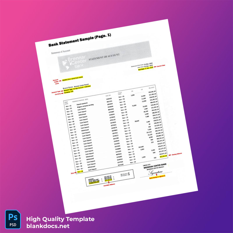 The USA Brennan Center Bank Bank Statement Template is your go-to solution for quick, hassle-free access to personalized bank statements in both Word and PDF formats. Effortlessly editable and designed for professional use, this template meets the urgent needs of creative and technical professionals alike.
