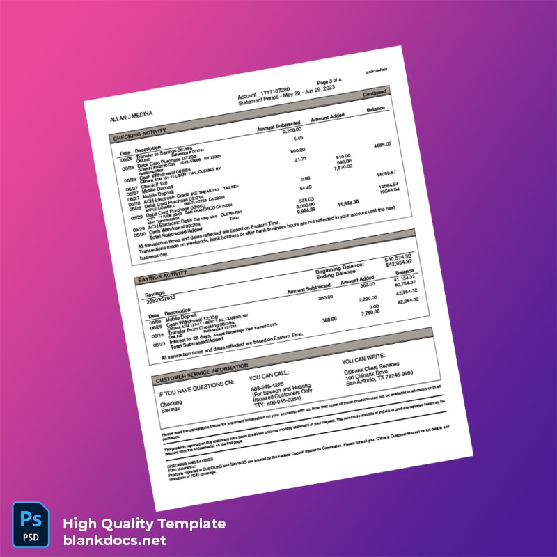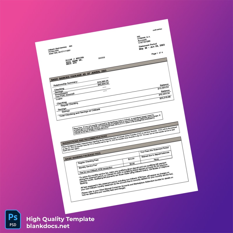 Don’t let disorganization or lost documents stand in the way of your financial success. Download your USA Citibank Bank Statement Template today and streamline your financial documentation process. You can explore more templates and related products to meet all your documentation needs at Bank Statement Templates.