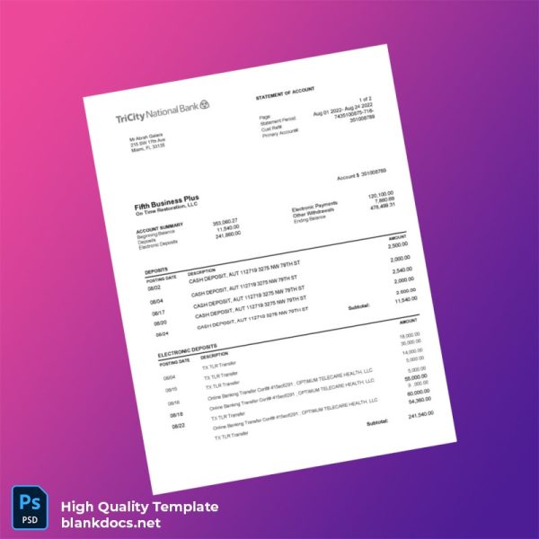 Are you struggling to provide a valid bank statement for your professional needs? Look no further than the USA Fifth Business Plus Statement Template, expertly crafted for those in urgent situations requiring editable bank statement documents. This template is available in both Word and PDF formats, ensuring that you can customize it to meet your specific requirements.