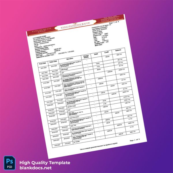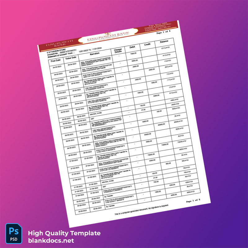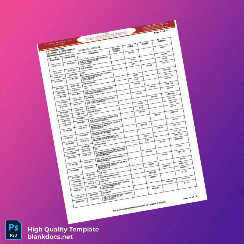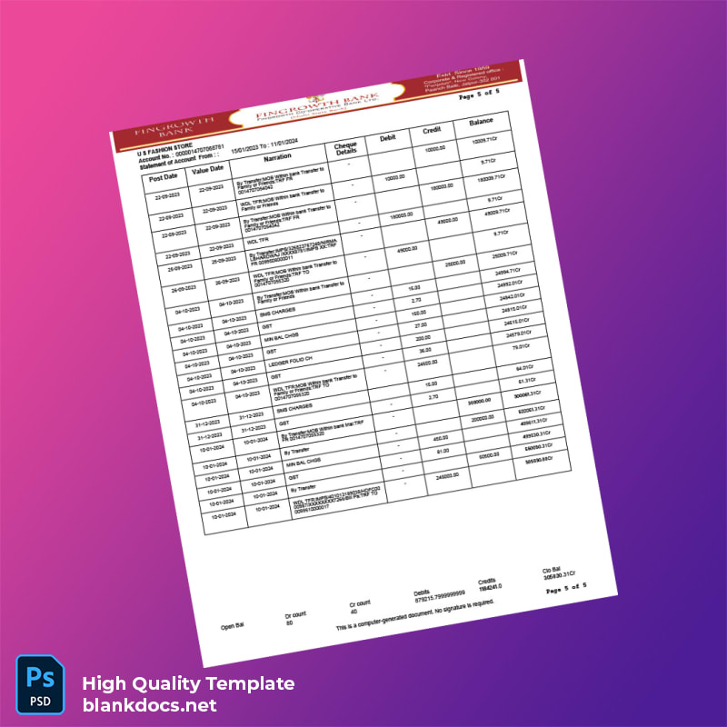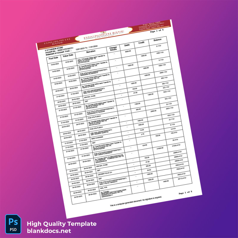 USA Fingrowth Bank Statement Template in Word and PDF formats 5 page