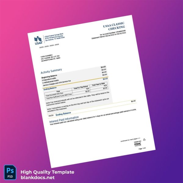 USA USAA Bank Statement Template in Word and PDF formats 2 page
