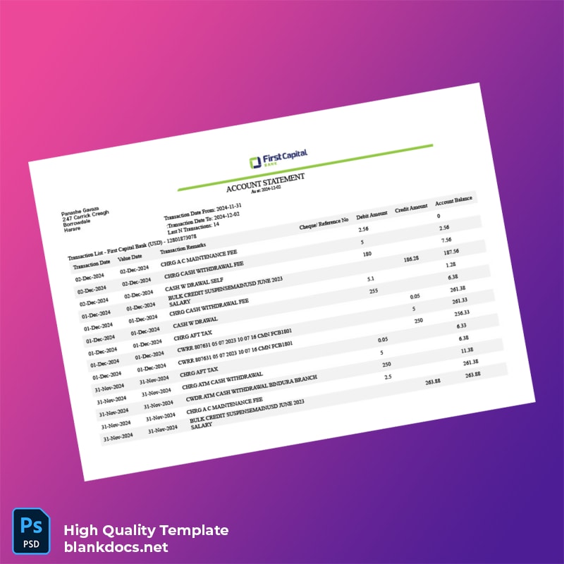 The Zimbabwe Template in Word and PDF formats is your ultimate solution for creating professional bank statements, effortlessly and efficiently. Whether for personal use, business transactions, or any official requirement, this editable bank statement template is designed to meet your needs with just a few clicks.
